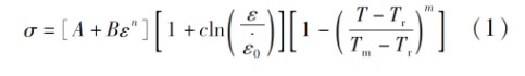 式中,A、B、C、m、n分別為材料模型參數(shù),數(shù)值如表2所示;為等效塑性應(yīng)變率,為參考塑性應(yīng)變率;σ為流動應(yīng)力;ε為等效塑性應(yīng)變;Tr、Tm分別為環(huán)境溫度與材料熔點。