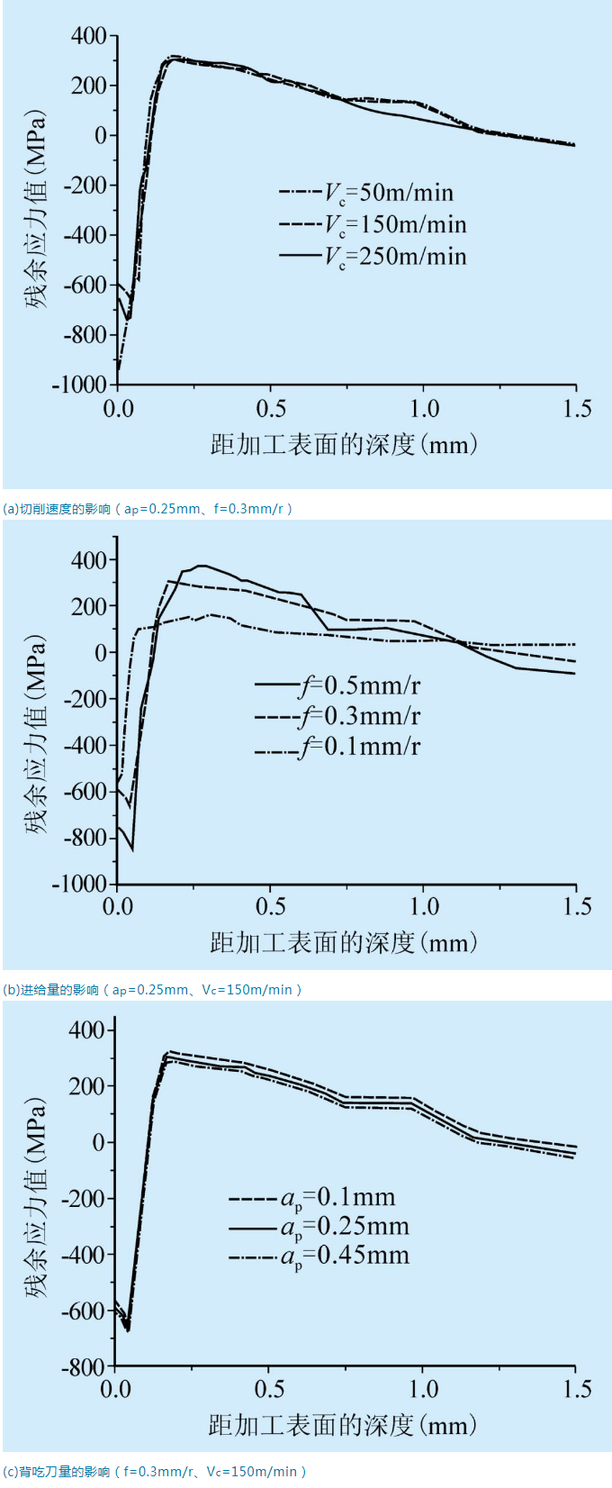 ?。?)背吃刀量對殘余應(yīng)力的影響不明顯:背吃刀量增加時殘余壓應(yīng)力Z大值和作用深度變化幅度均很小。