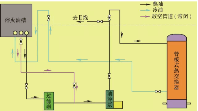 天津一汽夏利汽車股份有限公司內(nèi)燃機制造分公司熱處理滲碳生產(chǎn)線為1995年從德國引進(jìn),該生產(chǎn)線為雙排推桿式,淬火油槽為密閉式油槽,油槽溫度具備雙向溫度控制。升溫時,采用插入式電加熱器實現(xiàn),降溫時通過將油吸入管板式熱交換器冷卻(見圖1),淬火冷卻介質(zhì)為自來水。