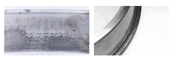 潤滑不足、選擇錯誤的潤滑脂和/或工作條件的突然變化可能導致軸承材料剝落(左圖)或軸承擋邊劃痕(右圖)