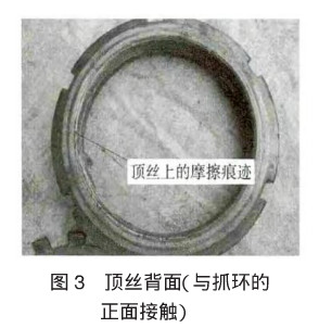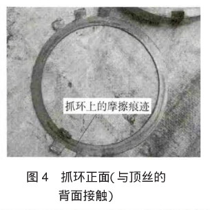 不過(guò)從圖二、圖三、圖四中可以看出抓環(huán)和頂絲的結(jié)合部有明顯的摩擦痕跡。