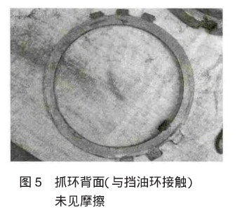 圖三、抓環(huán)正面(與頂絲的背面接觸)圖四、抓環(huán)背面(與擋油環(huán)接觸)未見(jiàn)摩擦以上幾圖我們初步判斷抓環(huán)和頂絲在電機(jī)轉(zhuǎn)動(dòng)時(shí),由于頂絲松動(dòng),造成頂絲和抓環(huán)有相對(duì)運(yùn)動(dòng),摩擦生熱。此為軸承溫度高的直接原因。