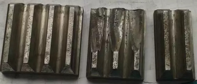 該零件的加工工藝過程為:原材料進廠檢驗→下料→鍛造齒坯→齒坯加工→滾齒→齒形幾何精度檢驗→滲碳→去碳層→淬火及回火→齒形精加工+磨齒形→清理輪齒、防銹和包裝。僅保留齒面的碳層,因此該齒輪齒面硬度高,心部綜合力學性能好。該齒輪使用約100h,產生齒輪斷齒事故,斷齒斷口及未斷裂齒宏觀形貌見圖1所示,對斷齒齒輪進行探傷后發現有些(未斷裂)齒的齒面存在裂紋見圖2所示。針對齒輪輪齒的斷裂,我們進行了以下分析。