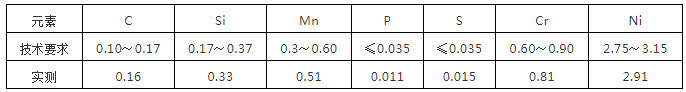 我公司生產的某型船用柴油機曲軸齒輪圖樣要求材料牌號為12CrNi3AGB/T3077-1999,滲碳層深度0.9~1.3mm(工藝滲層深度1.1~1.5mm),滲碳層硬度58~61HRC。