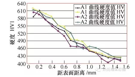 注:A1為有裂紋齒面兩側硬度曲線;A2為無裂紋齒面兩側硬度曲線