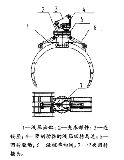 新型液壓回轉抓料器的結構如圖1所示,新型液壓回轉抓料器主要由七部分組成,分別是液壓油缸部件、夾爪部件、連接座部件、帶制動器的液壓回轉馬達部件、回轉驅動器部件、液控單向閥元件、中央回轉接頭部件。