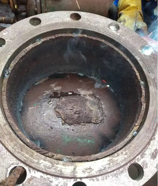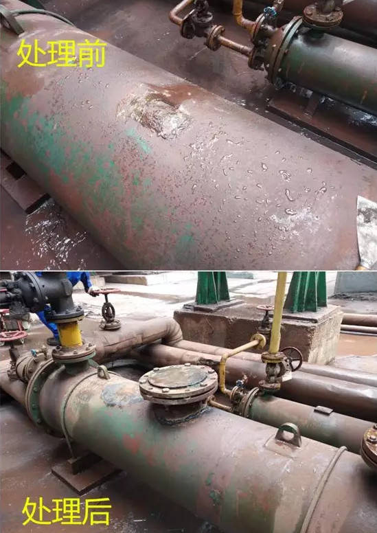 分析:潤滑油著火點在200℃左右,手工電焊電弧溫度在6000-8000℃,熔池平均溫度在1750℃左右,油系統動火,危險系數較高,處理不當,易引起火災,通常正確的處理方式是現將冷油器停運隔離,放空筒體中的存油,并進行清洗置換吹掃干凈,動火過程中筒體處于開放環境中。實際現場不具備施工條件,但冷油器筒體漏油是滲油,并不是呈柱狀噴射,泄漏量基本可控,并且冷油器在運行狀態下,潤滑油處于流動狀態,經過冷卻水的冷卻,油溫基本保持在40℃左右。綜合考慮下,決定進行帶壓堵漏。
