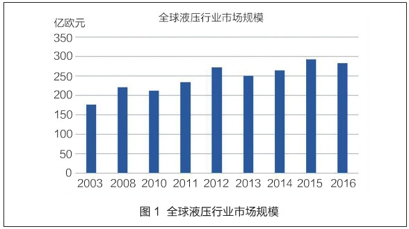 全球來看,2003年全球液壓行業市場規模為176億歐元,到2016年上升為282億歐元,市場規模快速擴大。中國液壓行業從無到有,在經過60多年發展后,已成為全球主要液壓市場。