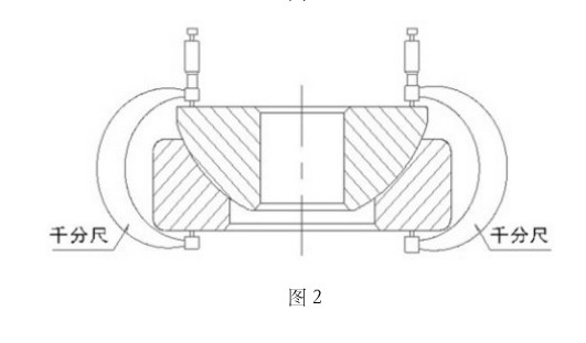 由于角接觸(推力)關節軸承內、外圈的工作滑動表面均為少半球面,外圈與內圈可以相互擺動,常用的高度測量儀無法對該參數進行測量。原有的檢測手段主要有兩種:種是采用芯軸法測量,如圖1所示。該檢驗方法有四個缺陷:(1)每種型號需配備一根與軸圈內徑尺寸一致的芯軸;(2)芯軸與軸圈是間隙配合,間隙太大,測量值誤差大;間隙太小,不容易裝、卸出芯軸,測量困難;(3)檢測大型號且批量大的產品,在裝、卸出芯軸過程中對檢驗人員的體力要求較高,勞動強度大,且稍有不慎可能壓傷手指;(4)每套次測量要重復裝、卸出芯軸,檢測效率低。第二種用千分尺測量法,如(圖2)所示。用兩把千分尺在產品的對稱位置進行測量,測量時需反復調整千分尺的測量值,直至兩把千分尺的測量值一致后,此時的測量值即為裝配高度。該種檢驗方法缺陷是:(1)兩把千分尺得多次調整才能得到測量值,測量繁瑣,效率低,不適合批量測量;(2)需要一定的測量技能,才能得到準確的測量值。以上兩種測量方法的缺陷主要是為了在測量中克服外圈與內圈可以相互擺動而造成的,所以如何在測量中快速保證兩測量基準面相互平行這個測量難點成為設計的重點及核心。為此,本人設計了這臺角接觸(推力)關節軸承裝配高度測量儀,以解決這一難題。