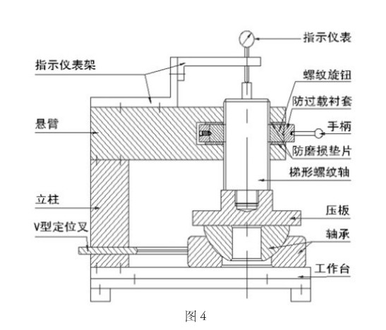 (1)本測量儀是利用軸承內、外圈可相互擺動且球徑同心,可自動調心的特點設計的,其中壓板與工作臺是否平行是影響測量精度的一個重要因素。為了保證測量精度,除基礎裝置各相關部件的剛性及形位公差保證外,梯形螺紋軸外徑與懸臂孔徑的配合間隙,在滿足梯形螺紋軸上下運動靈活的前提下,必須是精密的導向(間隙配合控制在0.02~0.04mm),以消除該間隙對測量精度的影響。