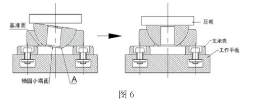 (3)由于角接觸軸承成品的軸圈非基準面與座圈基準面處于同一平面,如圖6所示,在軸圈壓平前,A點將低于基準面,所以測量時必須用支承塊墊高軸承的座圈才能實現裝配高度的測量。為此,我們在工作臺上設計了兩個可移動的支承塊支承被測軸承。對于推力關節軸承,由于軸圈小端面高于座圈基準面,在軸圈壓平前,A點不會低于基準面,所以可以拆除支承塊,將軸承直接置于工作臺測量。